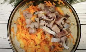 На заранее разогретой сковороде пассируем вместе 1 мелко нарезанную луковицу и 2 натертые на терке моркови. Отвариваем 2 картофелины. Перекладываем зажарку и нарезанный некрупно картофель в глубокую миску, перчим и солим. Туда же нарезаем кусочками филе слабосоленой сельди, добавляем приправы (здесь ориентируйтесь на свой вкус), перемешиваем и салат готов к подаче.