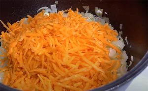 Пока грибы готовятся, можно заняться другими составными частыми паштета. Трем на терке морковь, мелко режем лук, после чего обжариваем вместе в толстостенной кастрюле или казане. Начинаем с лука, а как только он стал прозрачным, добавляем морковь и размешиваем. Тушим 5-7 минут, а потом выкладываем отдельно.