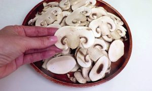 Измельчаем грибы и сразу ставим жариться на огне чуть выше среднего. Следом шинкуем на ту же сковороду петрушку и жарим постоянно помешивая, грибы не должны пригореть. Как только они приобретут приятный золотистый цвет, снимаем в отдельную миску.