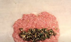 Расстилаем на рабочей поверхности пергаментную бумагу. Выкладываем фарш, на него кладем порцию грибов.