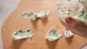 Тем временем к сливочному сыру нарежьте зелёный лук, смешайте. Немного поднявшееся тесто раскатайте в пласт, намажьте сливочным сыром с луком.