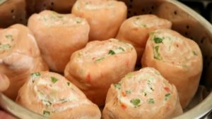 Готовьте булочки на пару в течение 12 минут (можно установить дуршлаг с бумагой для выпечки на кастрюлю с кипящей водой).