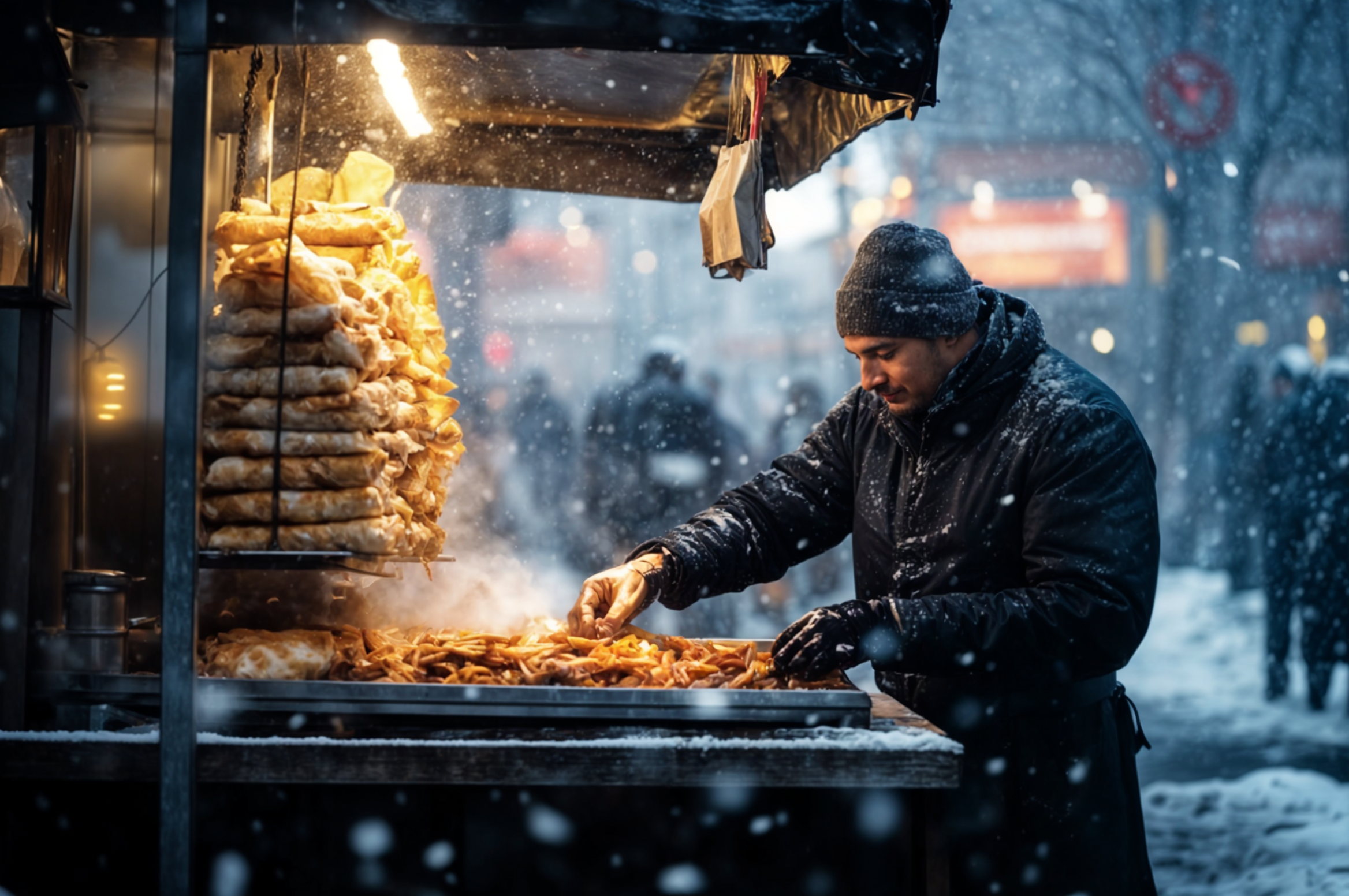 Sulla via del bus, vidi il chiosco di shawarma che c’era da quasi quanto lavoravo nel negozio. Era tra un negozio di fiori chiuso e un minimarket scarsamente illuminato.